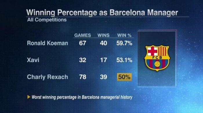 ESPN统计表明,哈维上任后执教了32场比赛只取17胜,胜率53.1%,队史第二差,仅优于雷克萨奇(79场39胜,胜率50%),不如前任科曼(67场40胜,胜率59.7%)。