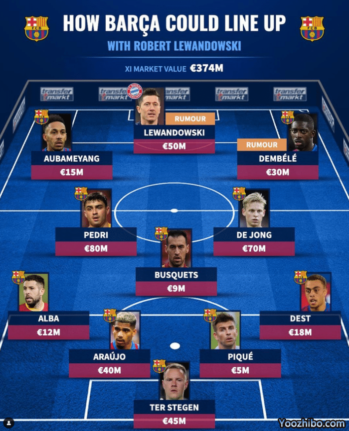 24直播网04月12日讯德国转会市场网今天预测了莱万加盟后的巴萨首发阵容,届时巴萨锋线将由3名前多特蒙德球员组成。