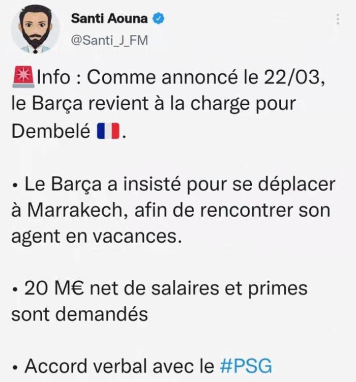 总监亲自前往马拉喀什与登贝莱的经纪人会面。他要求登贝莱的税后年薪+奖金要达到2000万欧。