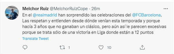 MelchorRuiz写道:“皇马对巴塞罗那的庆祝感到惊讶。皇马尊重巴萨,理解此前他们的处境和为什么三年没有赢得国家德比,但巴萨的庆祝依然太激烈了,因为这只是一场联赛胜利,而且他们在联赛落后皇马12分。”