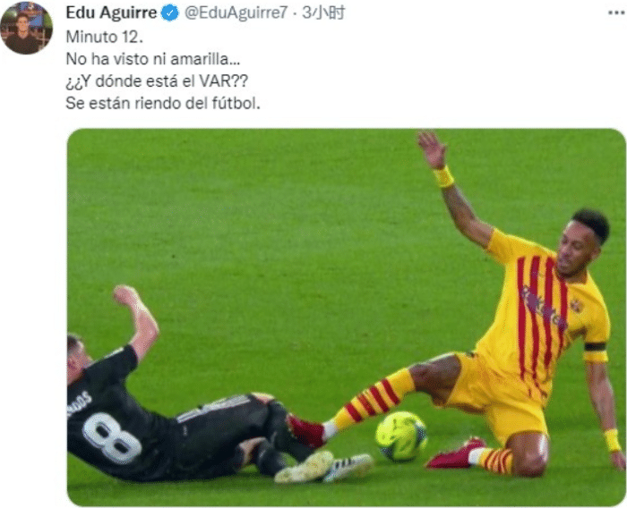 但皇马跟队记者阿吉雷并不满意裁判的判罚,他晒图并写道:“第12分钟奥巴梅扬的动作连黄牌都没有,VAR在哪里?他们在嘲笑足球。”