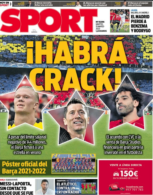 24直播网03月16日讯 据《每日体育报》今日头版消息,巴萨将在今夏引进一名超级巨星,莱万、哈兰德和萨拉赫均是候选目标。
