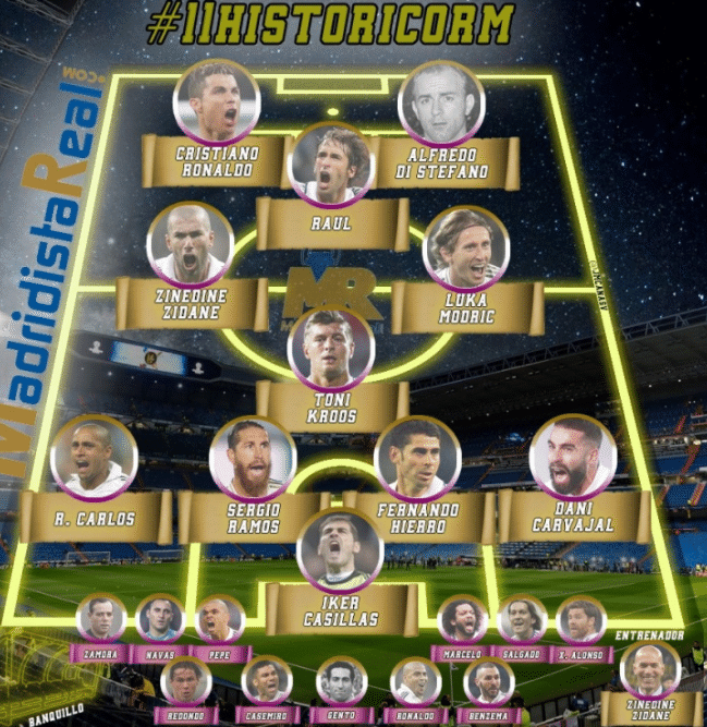 卡西、拉莫斯、齐达内、劳尔、C罗和迪斯蒂法诺等皇马传奇都进入了首发阵容,其中还有不少欧冠三连冠成员。