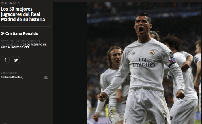 24直播网02月26日讯 《阿斯报》评选出了皇马历史上最伟大的50名球员,迪斯蒂法诺位居第一,C罗次席。