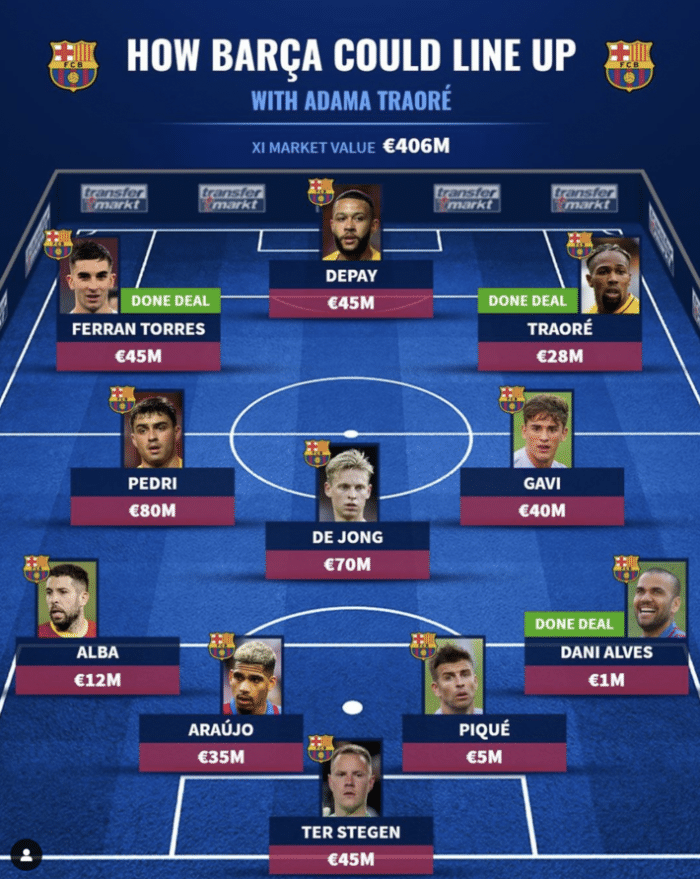24直播网01月30日讯 ,在不久前巴萨官宣签下阿达玛-特劳雷,随后德转对巴萨主力阵容进行了预测。