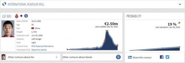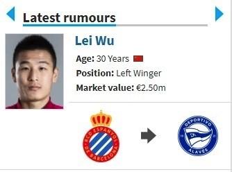 24直播网01月26日讯 ,在知名外媒德国《转会市场》的转会传闻列表中,赫然出现了武磊的名字。这也从侧面证实了武磊确实有可能在冬窗离开西班牙人队,而有意“国足一哥”的球队则是西甲阿拉维斯队。而德国《转会市场》甚至表示,武磊转会阿拉维斯的可能性已经达到了19%。