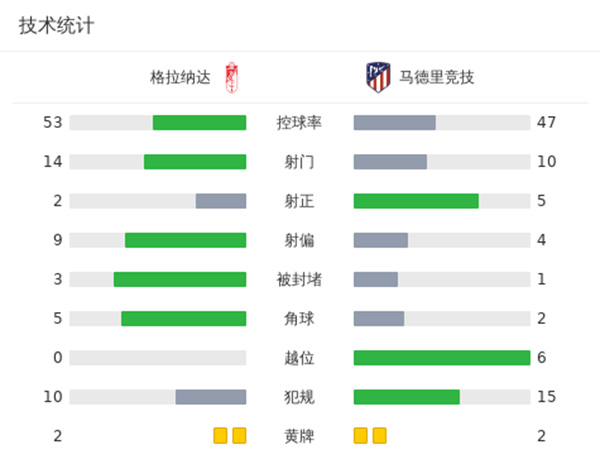 24直播网讯:北京时间1月23日西甲 联赛 第21轮,格拉纳达主场对阵马德里竞技。上半场,莫拉塔越位情况下推射被巴塔利亚出击解围,里克尔梅扣出角度兜射被没收,贡巴乌贴地斩偏出;下半场,利诺小角度抽射被扑,格列兹曼精准传中助攻莫拉塔甩头攻门入网,利诺再次打门稍高,萨乌尔头球破门被判越位进球无效,格列兹曼推射中柱后莫利纳补射被扑,希门尼斯禁区手球引争议,格列兹曼破门被判越位进球无效。最终比分0-1。