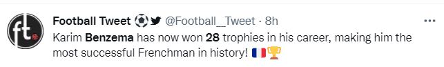统计表明,这是本泽马职业生涯赢得的第28座冠军,现在他已经成为历史上冠军最多的法国球员。