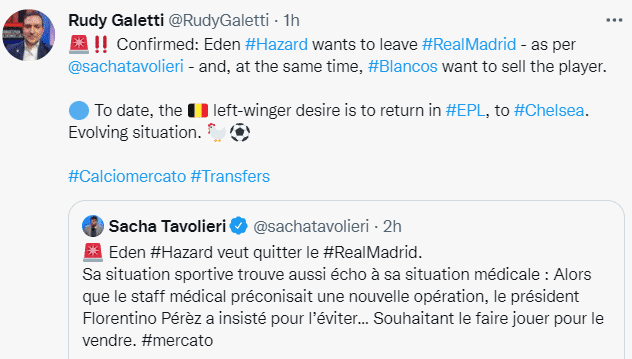 RudyGaletti则称阿扎尔现在希望回英超踢球,尤其是重回老东家切尔西,现在这笔交易正在推动当中。