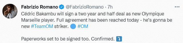 前国安外援巴坎布目前是自由球员,罗马诺表示,他已经与马赛达成协议,双方即将签约两年半。