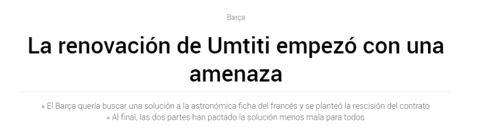 巴萨深知这样做的结果很可能是与球员对簿公堂,但他们不得不这样做。俱乐部不想续约乌姆蒂蒂,乌姆蒂蒂也不想降薪,但权衡之下,双方意识到这是对各自最好的解决方法。
