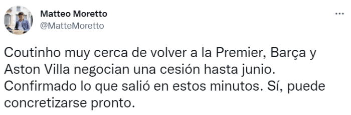 该记者表示,库蒂尼奥接近回到英超联赛,巴萨和阿斯顿维拉正在就这笔交易进行谈判,双方目前还没有达成协议。预计库蒂尼奥会先租借加盟维拉半年,不过维拉想要在租借合同中加入买断条款。