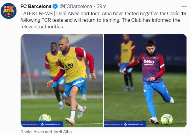 巴萨官方:阿尔维斯&阿尔巴新冠检测转阴