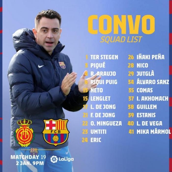 24直播网01月02日讯,巴萨公布了客战马洛卡的大名单。由于疫情和伤病的原因,一线队只有11人入选。其中之前感染新冠病毒的乌姆蒂蒂和朗格莱进入名单。