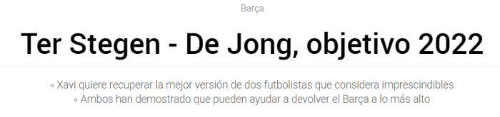24直播网12月27日讯 据西班牙媒体《每日体育报》报道,巴萨主帅哈维在2022年的首个目标是帮助特尔施特根和德容恢复状态。