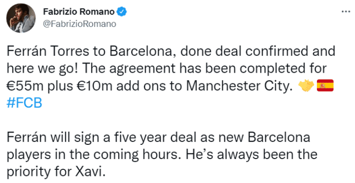 罗马诺表示,Herewego!费兰-托雷斯加盟巴萨的交易已经完成,转会费为5500万欧元+1000万欧元浮动。他将会和巴萨签订一份5年的合同,哈维自从上任以来,一直将费兰视为首要引援目标。
