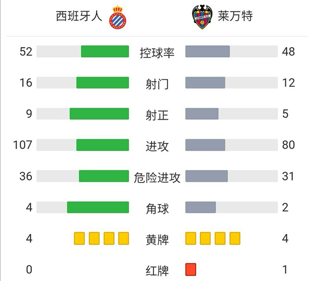 全场比赛结束,西班牙人4-3惊险击败莱万特。