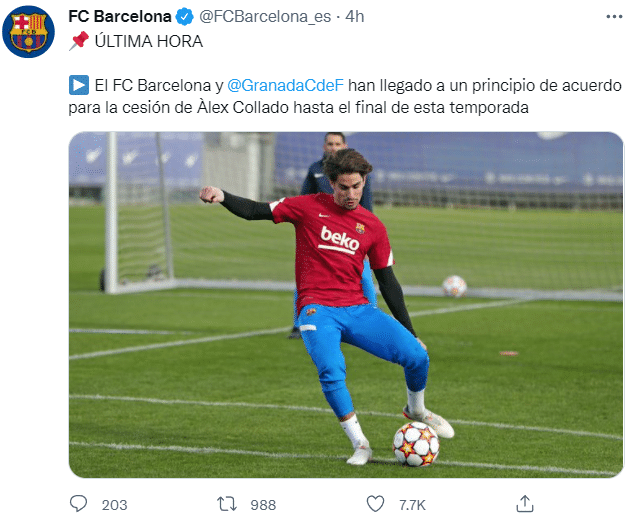 24直播网12月10日讯 据巴萨官方消息,俱乐部已与格拉纳达就科拉多租借交易达成了协议,科拉多将租借加盟格拉纳达,租期至本赛季结束。