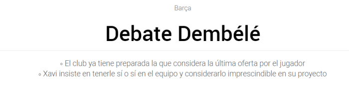 《每体》表示,登贝莱的合同在明年夏天到期,但是他在1月就可以与其他俱乐部谈判。巴萨主帅哈维希望将登贝莱留下,他将登贝莱视为球队阵中关键球员,因此巴萨方面准备为登贝莱开出最后一份续约报价,年薪将达到1100万欧元。