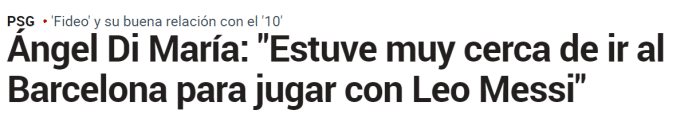 迪马利亚说:“在与巴黎续约前,我曾经很接近加盟巴萨,我当时有意去巴萨的唯一理由就是想和梅西一起踢球。不止国家队,我希望和他也做俱乐部的队友,因为和他一起踢球是世界上最棒的事。”
