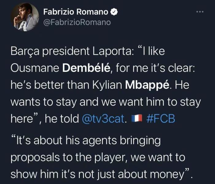 拉波尔塔说:“我喜欢奥斯曼-登贝莱,对我来说很明显,他比姆巴佩要强。他想要留下来,我们也希望他留在这里。”