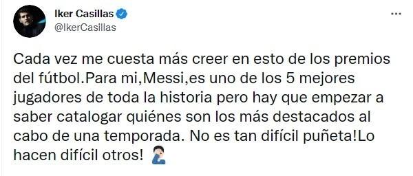 德国方面为莱万叫屈,皇马这里则是为同样状态火爆的本泽马鸣不平。前皇马队长卡西利亚斯就发文对金球奖评选提出了质疑。卡西甚至还在文中爆粗表达不满:“对我来说越来越难相信足球奖项了。我认为梅西是历史前五的球员,但你需要知道在赛季结束时怎样列出谁是表现最突出的球员,XX这没这么难!别人把这个问题搞复杂了!”
