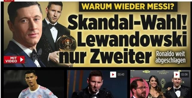 当金球奖结果揭晓后,德国权威媒体《图片报》对此表示了强烈不满。《图片报》直接在头版头条打出了“为什么又是梅西?丑闻般选择!莱万只获得了第二”的标题。