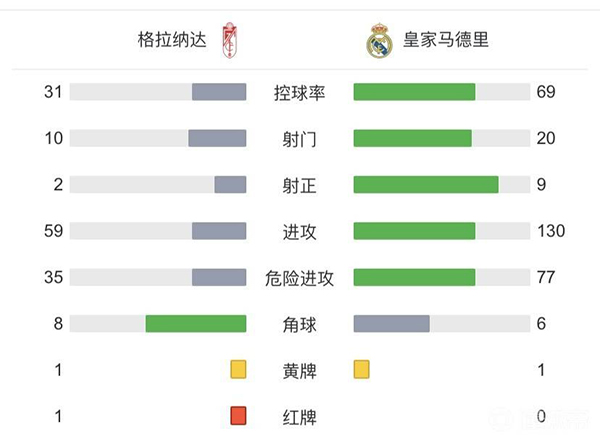 全场比赛结束,皇家马德里4-1格拉纳达。