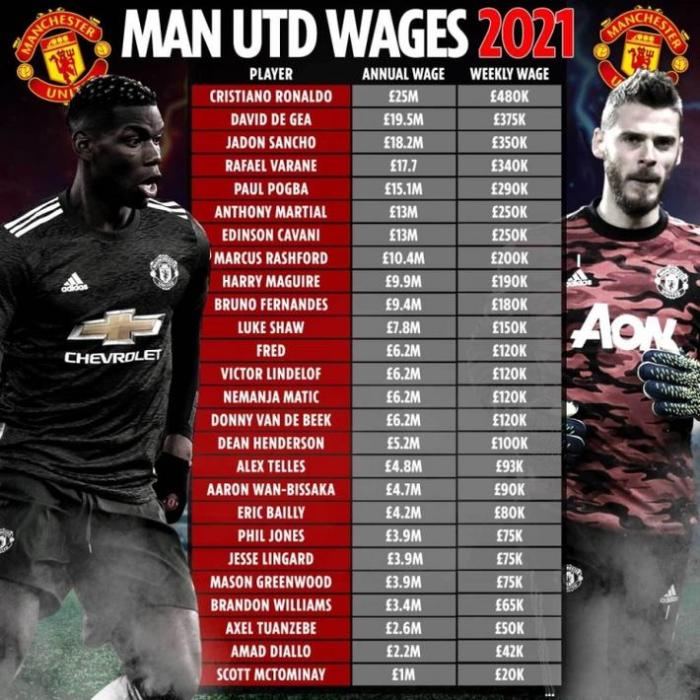 24直播网11月18日讯 《太阳报》今日盘点了曼联队内周薪排行榜,其中C罗薪水最高,曼联队内有多达四名球员周薪超过30万英镑。