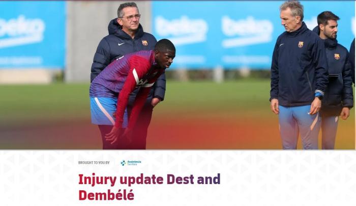 24直播网11月05日讯 今日,巴塞罗那俱乐部官方宣布,登贝莱左大腿肌肉拉伤,德斯特腰部疼痛。