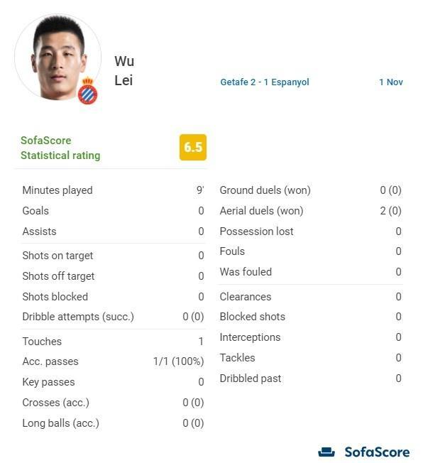 24直播网11月01日讯今天凌晨,西班牙人在西甲第12轮客场1-2不敌赫塔费,武磊在下半场最后阶段替补登场,以下为他本场比赛的数据。