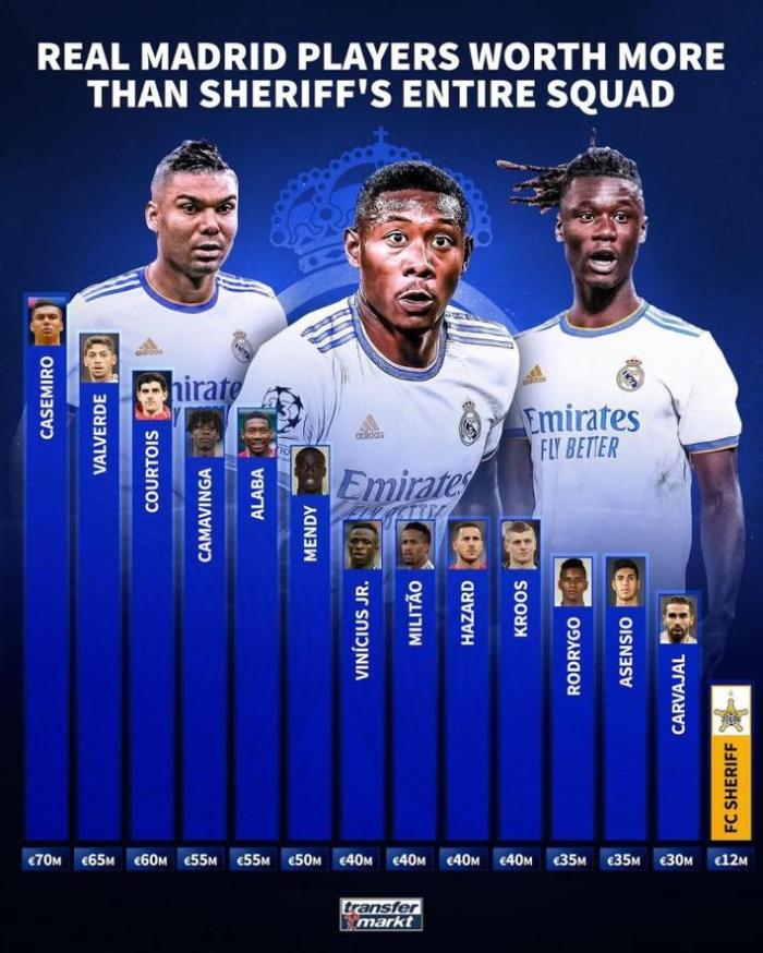 24直播网10月02日讯 今日据德转统计了皇马球员身价,其中皇马全队有13人的身价超过了谢里夫全队,谢里夫全队身价仅为1200万欧。