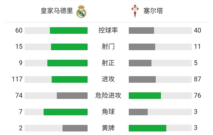 伤停补时3分钟,全场比赛结束,最终皇马主场5-2逆转塞尔塔。