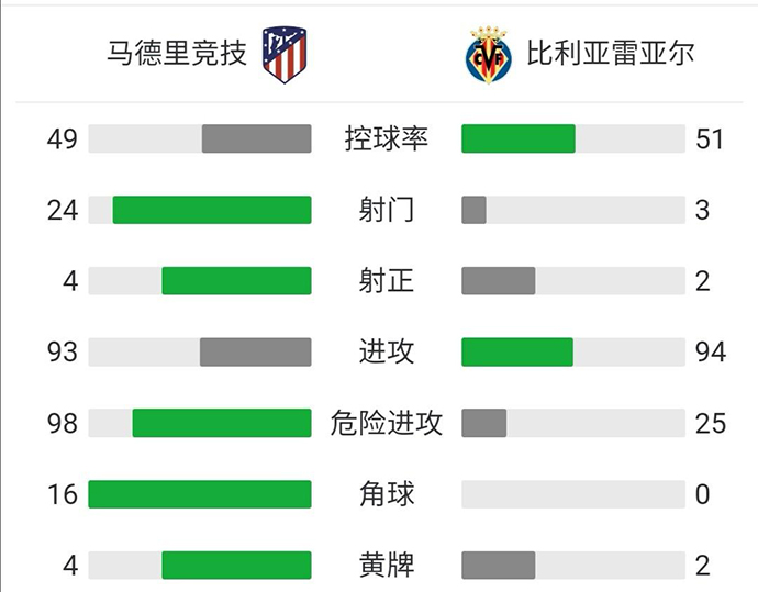 全场战罢,最终,马竞2-2比利亚雷亚尔。