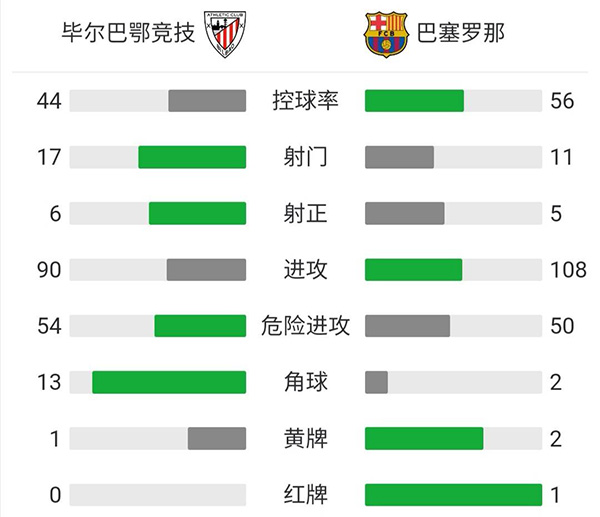 最终全场比赛结束,巴塞罗那客场1-1战平毕尔巴鄂竞技。
