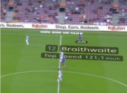 24直播网讯 比赛中,发生了一件有趣的事情。西甲的转播画面出现了失误,将巴萨球员布莱斯维特的跑动速度标为了121.1km/h。