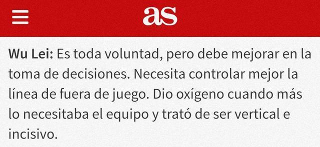 《阿斯报》表示:“武磊展示了不错的意志力,但需要在决策能力上进行提升,更好的控制越位线。他在球队最需要的时候提供了新鲜血液,并尽可能向前进攻来形成对对手的威胁。”