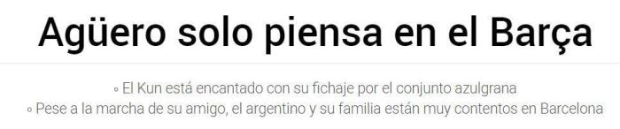 《每体》表示,阿圭罗已经告知巴萨俱乐部,他非常高兴来到这里,并且希望在巴萨取得成功,即使无法和梅西一起踢球。同时,阿圭罗还表示他很喜欢巴塞罗那这座城市。