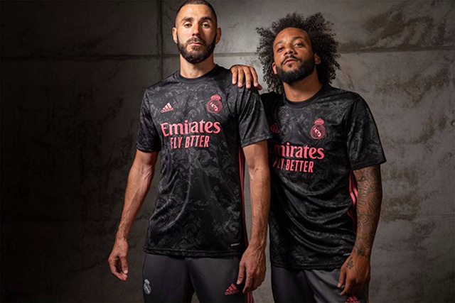 新球衣拥有简约舒适的圆领设计,亮眼的粉色装饰球衣胸前的俱乐部徽章、adidas Logo以及胸前广告。球衣两侧的阿迪达斯胜利三条纹也使用亮眼的粉色装饰,在黑色球衣的衬托下显得格外醒目。背后衣领下方加入以低调黑色呈现的俱乐部名称印花“Real Madrid”。