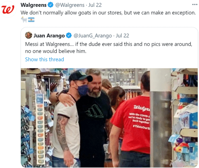 24直播网讯 梅西近日现身美国一家知名药房,并被球迷们发现,虽然这家药房的官推调侃称“山羊不许入内,但这次可以例外”。