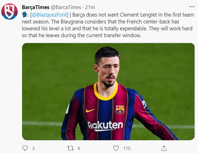 这位记者在其推特上写道:“巴萨不希望朗格莱下赛季仍在一线队中,他们认为这名法国中后卫的水平已经下滑,并将他看作可以出售的球员,巴萨将在今夏尝试将他出售。”