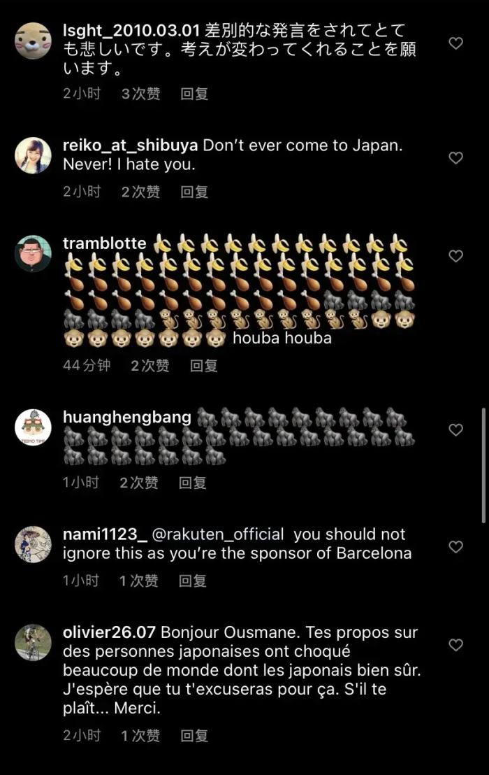 本身巴萨的几大知名赞助商当中就有日本公司存在,而且巴萨一直以来在日本的影响力是很大的。此时登贝莱却爆出这样的歧视性言论,这引起了日本网友的不满。不少日本球迷直言,应该让登贝莱赶紧滚出巴萨。还有日本网友认为,登贝莱本身就是黑人,随便一个亚洲人拉出去颜值都比他高。同时还有网友发布一些猴子和香蕉的表情予以还击,连带着格列兹曼也遭到了日本网友炮火的波及。