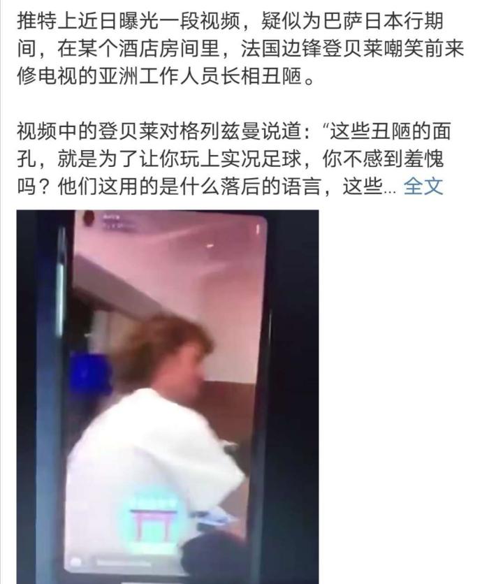 24直播网讯 北京时间7月4日讯:近日,法国球星登贝莱和格列兹曼又被推上了舆论的风口浪尖。有人在推特上翻出了一段貌似巴萨日本行的视频,视频当中几名亚裔工作人员正在维修酒店房间内的电视机。而登贝莱一直在旁边喋喋不休,他对着格列兹曼说道:这些丑陋的面孔就是为了让你玩上实况足球,你不该感到羞愧吗?他们用的什么语言?我们是在一个发达国家还是一个不发达国家?