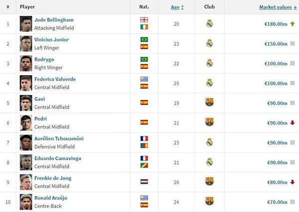 除了贝林之外,皇马还有威尼休斯、罗德里戈和巴尔韦德这3人身价突破1亿欧元,他们也包揽了西甲身价排名的前四位。值得注意的是,西甲身价前10名,都被皇马和巴萨球员包揽。