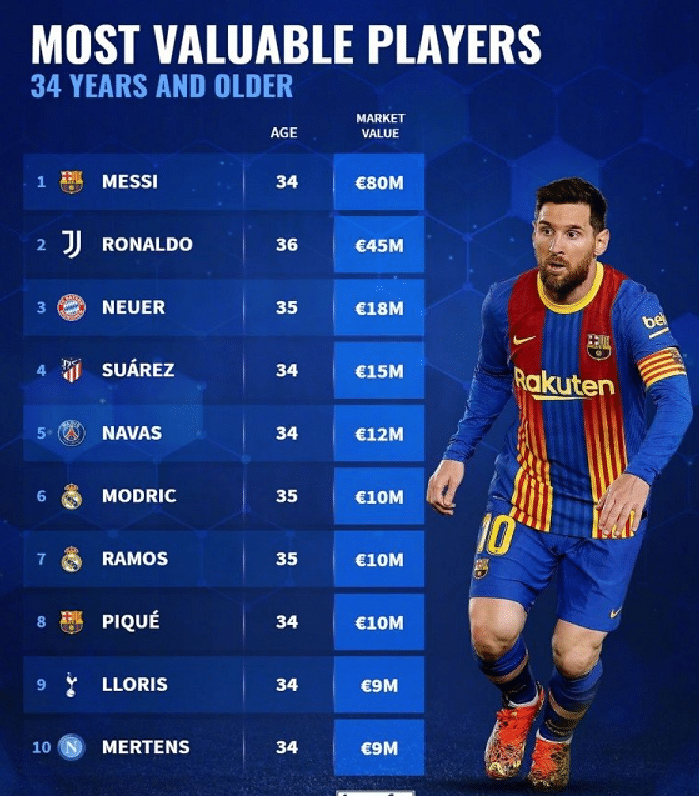 24直播网讯在足坛,许多球员在30岁之后,身价都有急速下滑,特别是超过了34岁之后,即便你再优秀,身价也不过在一两千万左右,不过也有部分球员是例外的,比如足坛最好的球星梅西和C罗,即便他们超过了34岁,他们的身价依然居高不下,那么他们的身价到底有多高呢?近日,德国权威媒体《转会市场》盘点了足坛34岁以上球员的身价排名,其中梅西在第一档,而C罗在第二档,其他人共享第三档。