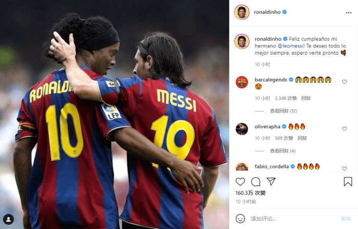 24直播网讯 梅西昨天迎来34岁生日,前队友罗纳尔迪尼奥在Instagram上发文祝贺,并晒出两人的昔日合照。