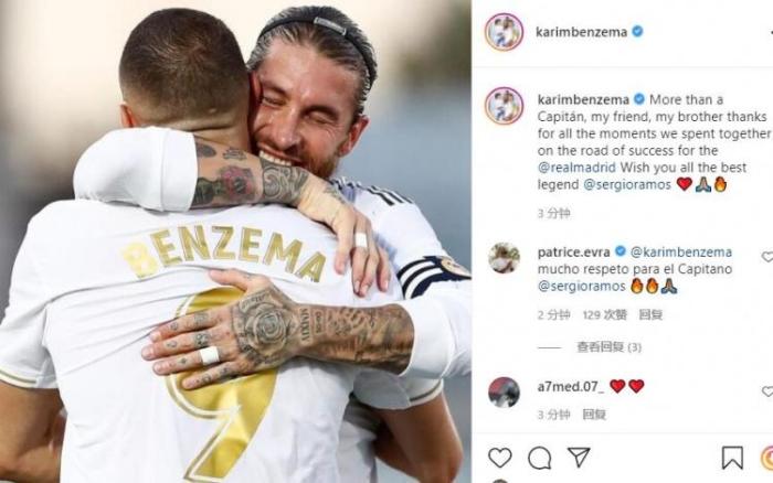 本泽马在个人INS上写道:对我来说你比一个队长、朋友和兄弟意味更多,感谢我们共度的时间和一起在@皇马走过的成功之路,送给你最好的祝福@拉莫斯。
