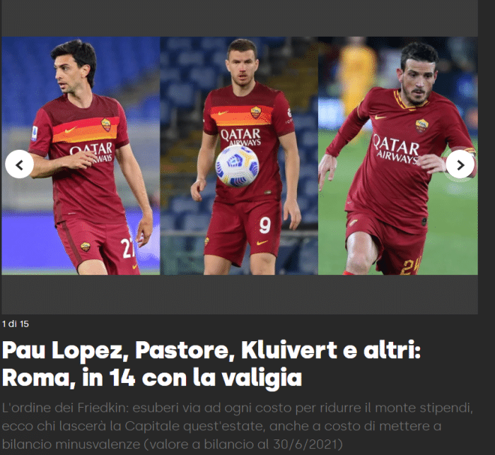 近日,《罗马体育报》报道,罗马老板弗里德金要求球队开始清洗,而14名球员进入了清洗名单,弗里德金希望通过清洗球员减轻球队的薪资负担,同时也希望可以因此获得一些转会费,用于今夏的引援。而这14人分别是哲科、法齐奥、佛罗伦齐、桑顿、比安达、比利亚尔、克里奇、奥尔森、云代尔、恩宗齐、小克鲁伊维特、帕斯托雷、迪亚瓦拉和洛佩斯。