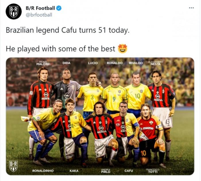 24直播网讯 昨天是巴西边后卫卡福的51岁生日,而欧洲权威媒体BR也适时的在推特上晒出了卡福队友的“最佳队友”阵容,而这个阵容可以说是群星荟萃,里面的球星几乎都是卡福同时代足坛最佳的球员。毕竟,卡福当初效力过米兰、罗马和巴西国家队。而当时的米兰和罗马都是足坛数一数二的球队,而巴西国家队在当时也是足坛独一档的球队哦!