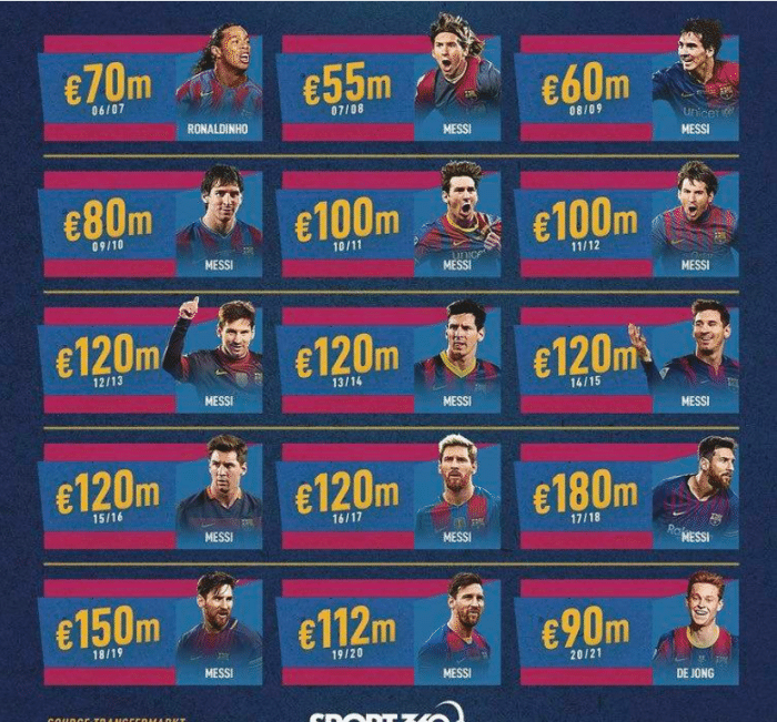 不得不说,梅西对巴萨真的很重要,而且,这个身价的数据都无法显示出梅西的优秀,要知道,这个只是德转给出的球员身价,在当时如果你真的去买梅西,按照身价去报价,你是肯定无法得到梅西的。要知道,当时内马尔的转会费都高达2.22亿欧元,梅西要是在巅峰期转会的话,怎么也要比内马尔高一些吧!您认为,如果巅峰期的梅西转会,转会费至少要多少?